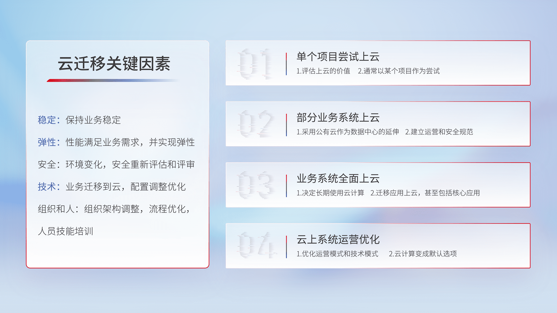 结合实际业务,,从规划设计、、、云平台选型、、、云原生改造、、数据迁移、、、集成交付,,,,迁移全过程为客户识别最佳上云路径,,做好风险识别管理,,,设计网络架构、、、身份权限、、、安全审计合规、、、操作审计、、日志审计、、监控告警策略、、、多站点容灾设计等,,,对云上基础设施进行整体规划,,,,提升IT治理水平,,,,以满足弹性、、高可用、、、、高性能的需求。。。