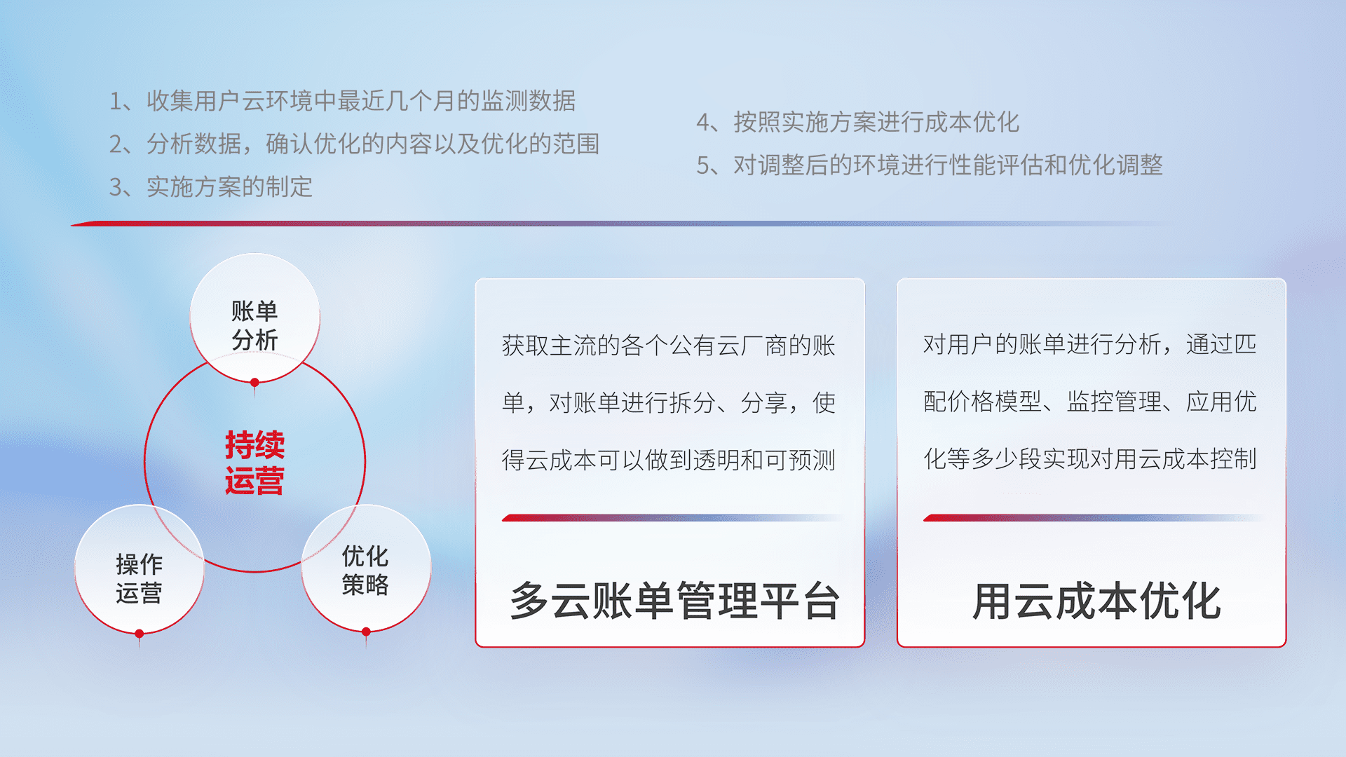 通过多云纳管,,,,以统一的资源数据模型把客户的云资源进行抽象和封装,,,,进而实现对多云资源的统一操作,,,,保障云资源管理的可靠性、、、稳定性与可用性。。量身定制化运维内容,,配置、、开发运维、、补丁管理、、、、备份、、监控、、、认证和访问管理、、、、审计和日常巡检等,,,保障在用云过程中的可靠度,,,稳定度以及高可用率。。